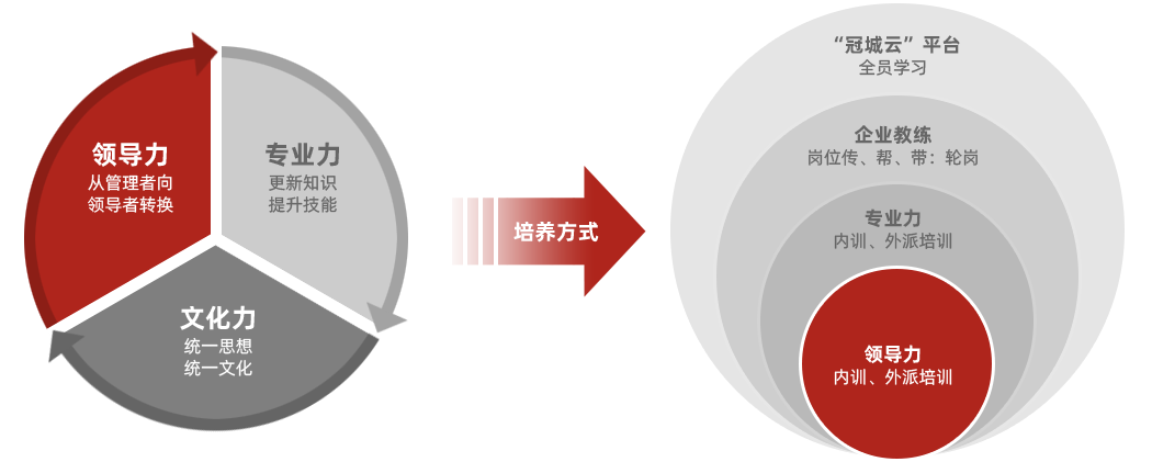 通过专题内训、外派培训、“冠城云”线上学习、冠城名师讲堂、跨界分享会、上级/导师辅导、企业教练、行动学习、定期轮岗机制等多渠道、多元化的人才培养机制,致力打造学习型组织。