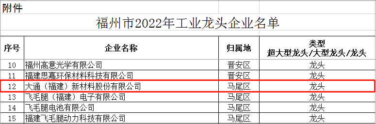 近日,福州市工业和信息化局公布了2022年福州市工业龙头企业名单,大通新材连续两年获评福州市工业龙头企业。 据悉,福州市工业龙头企业,是福州市按照“扶引大龙头、培育大集群、发展大产业”的战略部署,所培育的具有国际竞争力、区域影响力、产业带动力的工业企业 ......