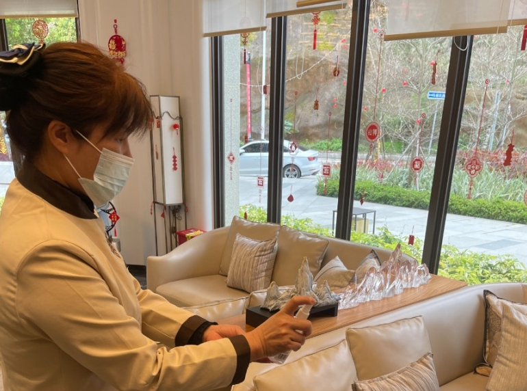 在售的凯时华玺项目,所有员工每日按时测量体温,工作期间全程佩戴口罩。为每位到访客户提供一对一的接待服务。同时,华南区域公司定时对售楼部公共区域、卫生间、会议室等区域进行全方位消毒,确保无遗漏,给每位员工及客户提供一个安全、放松、舒适的环境!