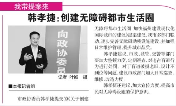 市政协委员韩孝捷提交《关于创建无障碍都市生活圈 加快福州建设现代化国际城市的建议》提案,建议我市多部门联动逐步完善无障碍助残设施建设,加强日常维护管理,形成固定机制,提升城市品质。城市中最常见的无障碍出行设施包括无障碍坡道、盲道、升降平台、扶手、相关标志等。全龄化城市的无障碍设施惠及每个人,为“有需求者”提供方便和安全空间。针对我市部分盲道被占问题,韩孝捷建议,市政、城管、交警等有关部门加大整顿力度,定期巡查和对违占盲道进行处罚,实时处理改进。对于盲道破损老旧、塌陷不平、地砖松动和设计不到位等问题,建议市政部门加大日常巡查、维修、改造的力度。