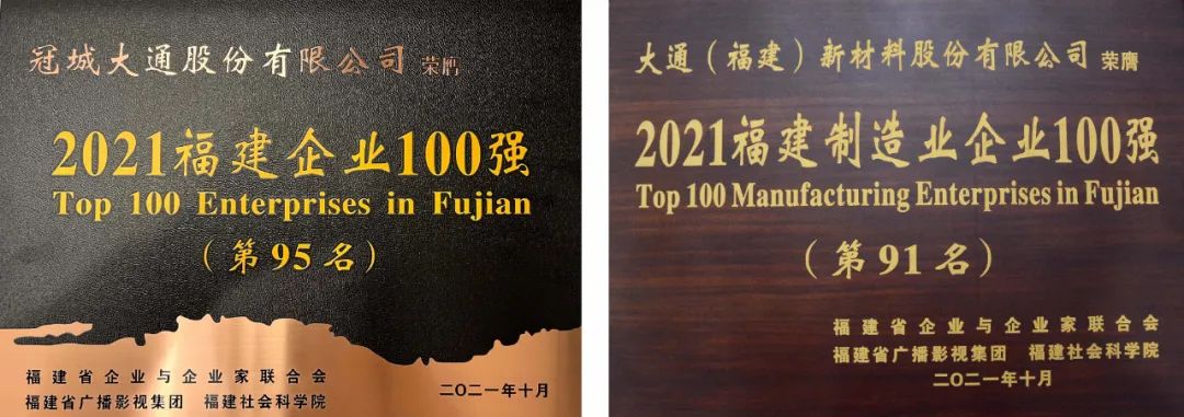 2021年11月3日,由福建省企业与企业家联合会、福建省广播影视集团、福建省社科院联合主办的“2021福建企业100强发布大会”在福州举行。凯时入选“福建百强企业”,大通新材入选“福建制造业企业100强”。