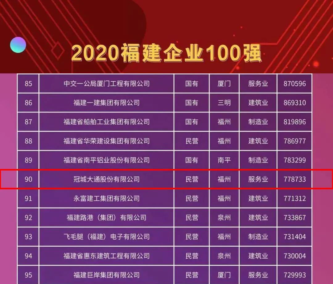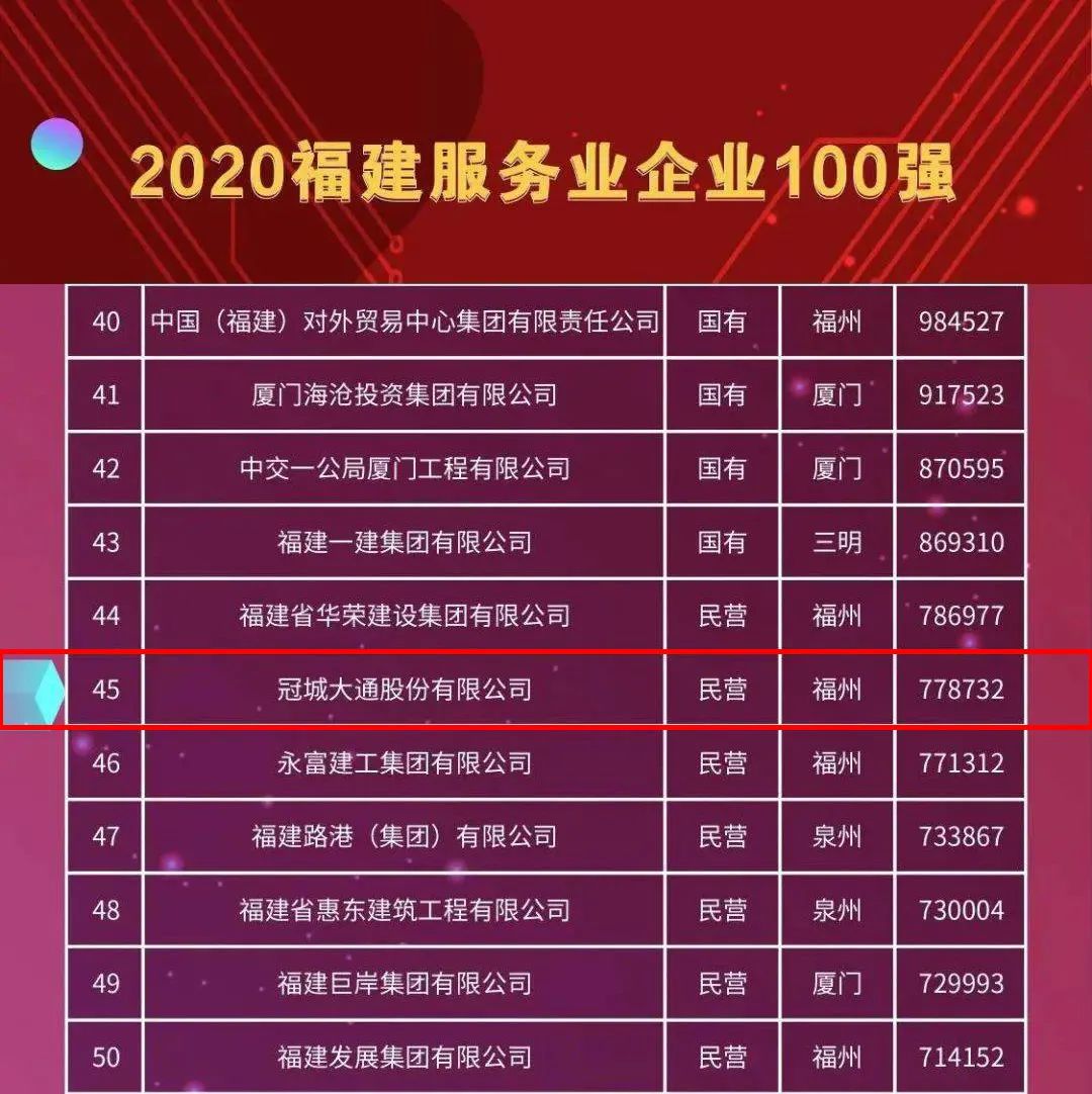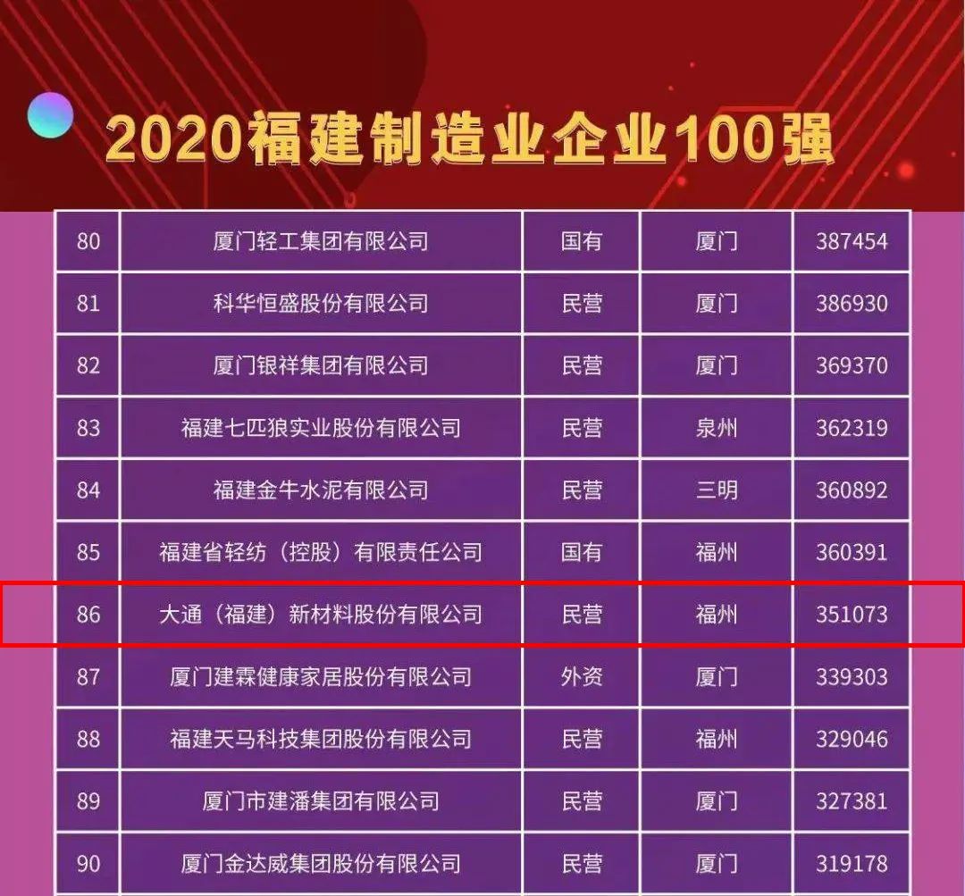 2020年11月21日,由福建省企业与企业家联合会、福建省广播影视集团、福建省社科院联合主办的“2020福建企业100强研究发布大会暨福建企业家高峰论坛”在宁德隆重举行,会上权威发布“2020福建企业100强”榜单。凯时入选“福建百强企业”与“福建服务业百强企业”,荣膺双百强。大通新材入选“福建制造业企业百强”。