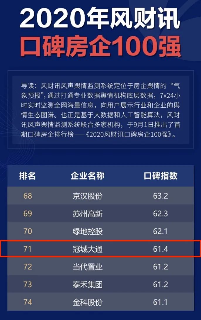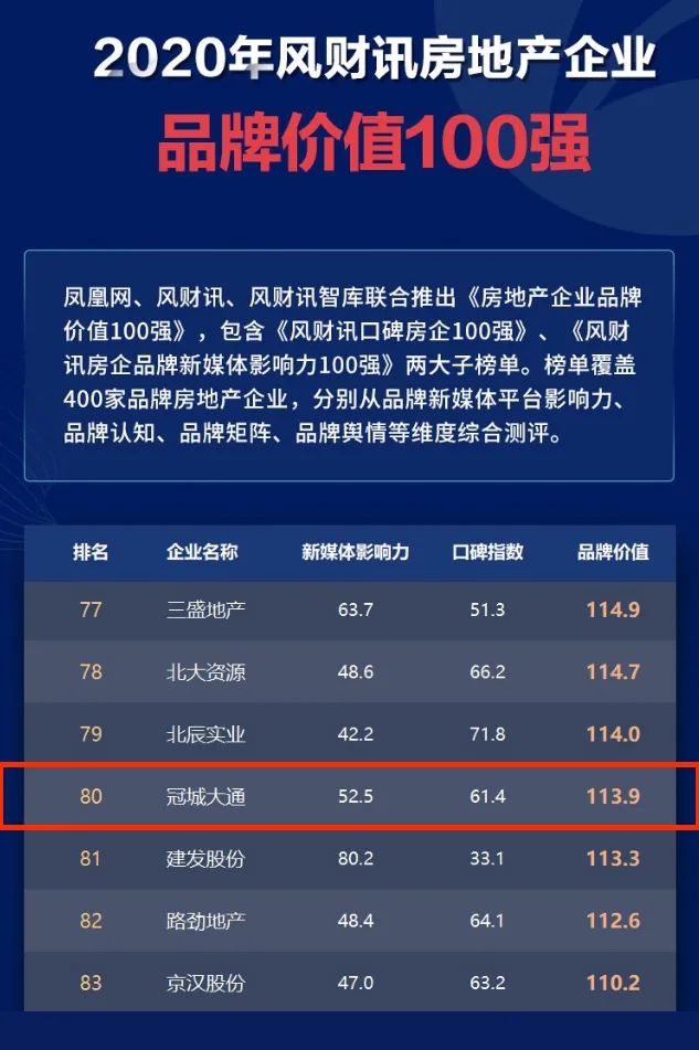 9月1日,凤凰网、风财讯、风财讯智库联合发布了《房地产企业品牌价值100强》系列榜单,凯时荣登全国地产企业品牌价值百强。榜单还同时发布了《口碑房企100强》、《品牌新媒体平台影响力榜》两大子榜单,凯时均入选。
