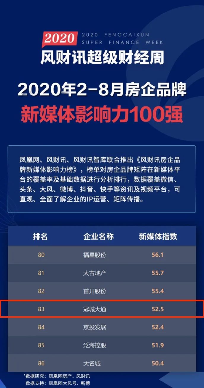 据悉,此次榜单是由风财讯“风声”舆情监控系统联合凤凰网大风号数据、新榜大数据、清博大数据等权威平台,及多源公开数据,设置16项参评标准,从品牌新媒体平台影响力、品牌认知、品牌矩阵、品牌舆情等维度综合测评房企品牌竞争力。
