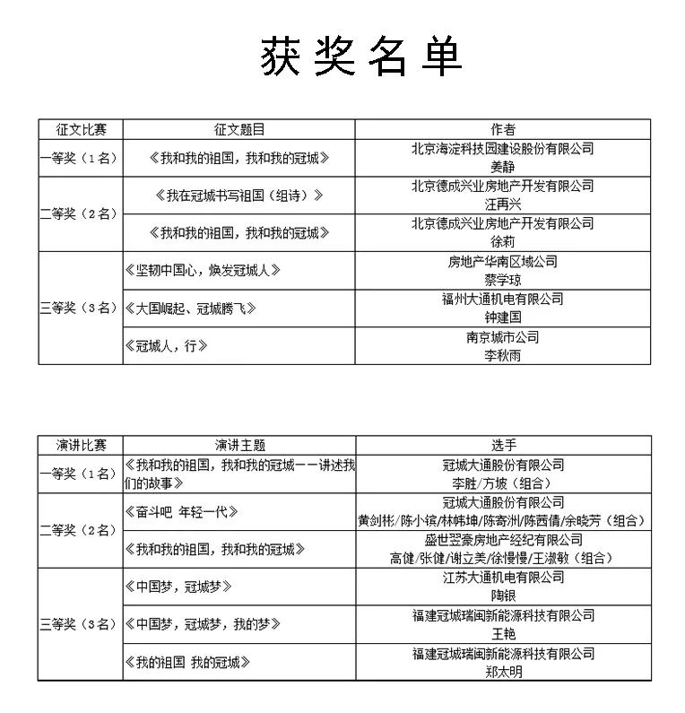 本届读书活动分设征文和演讲两种比赛形式。征文比赛环节共收到来自各家公司的44篇征文投稿,通过内部评委、外部专业评委的综合评选,最终评选出六篇优秀征文。在精彩纷呈的演讲比赛环节,此前通过公司淘汰赛、区域选拔赛等各个环节,共13组选手进入了当天集团总决赛。本届读书活动,参赛员工们均结合祖国发展、公司进步及个人成长,以多种形式表达了对祖国、对冠城的深厚感情。