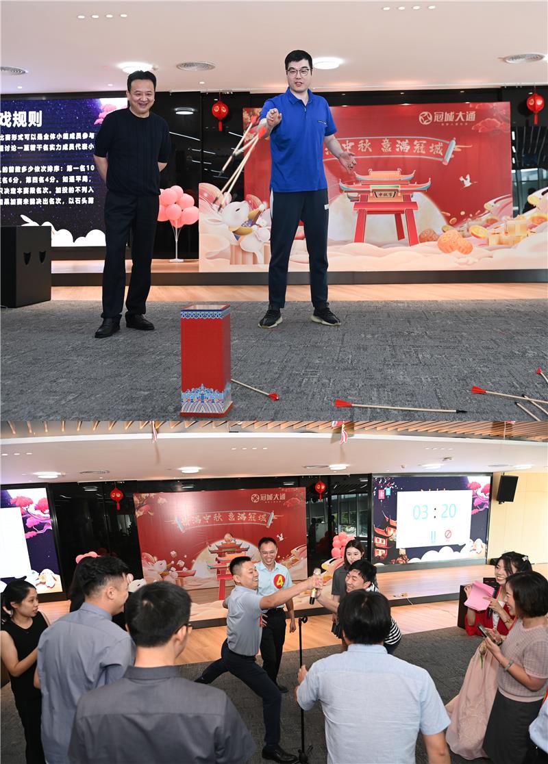 随后,丰富的趣味竞赛和中秋博饼接连上演,在投壶比赛中,各小组成员代表屏气凝神,捏、瞄、投,投中后引来一片叫好声;在猜灯谜和对“月”当歌的项目中,各小组更是集思广益,绞尽脑汁,充分展现了凯时人奋勇拼搏、齐心协力的精神。最终获胜的小组获得了象征吉祥团圆的团扇和香包。