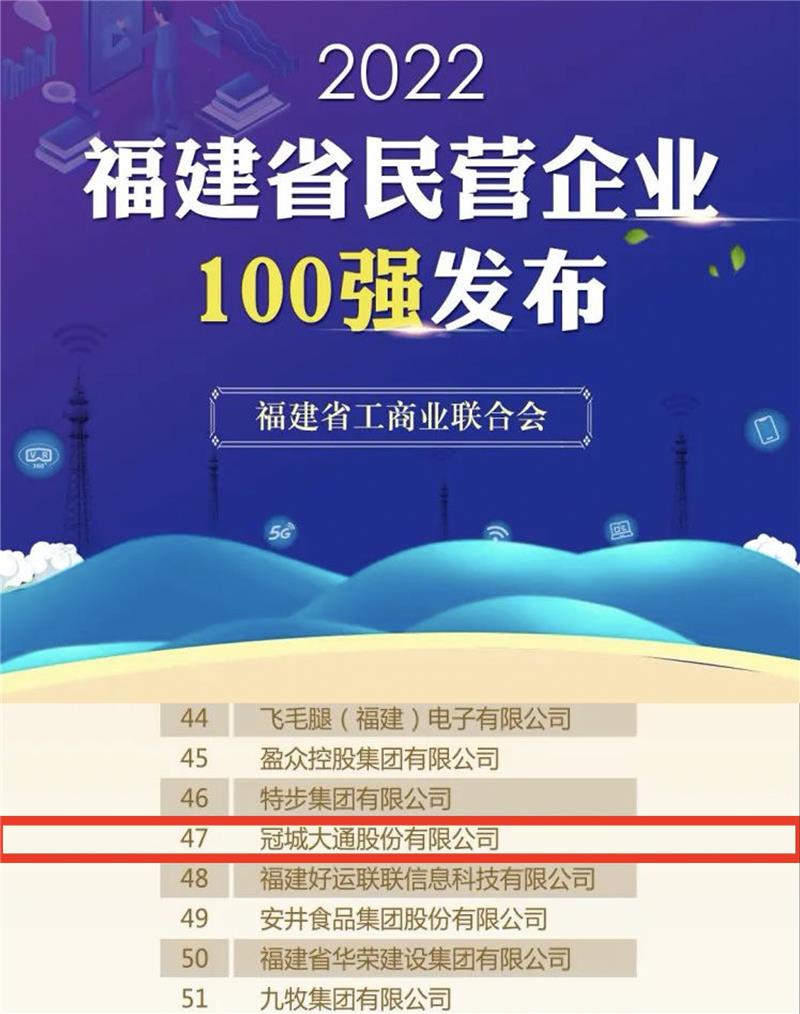 9月26日,福建省工商联正式公布“2022福建省民营企业100强榜单”,凯时股份有限公司再度入选榜单,这是对公司综合实力的权威认可。