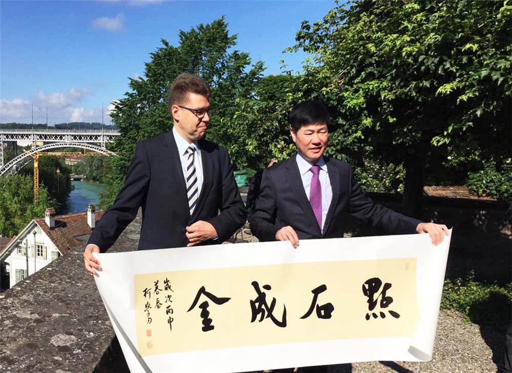 此外,韩孝煌副董事长与代表团一行共同拜见了瑞士伯尔尼经济部长安德烈·瑞肯巴赫,进行了亲切而有效的会谈,进一步了解目前欧洲经济发展情况,并就如何加强贸易、金融等经济领域的合作进行了深入的探讨。